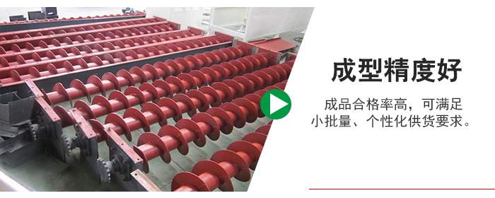 4、 與連軋技術相比,成型精度好,成品合格率高,可滿足小批量、個性化供貨要求,特別適用于大規格,大厚度及耐磨鋼、不銹鋼材料的螺旋葉片生產。