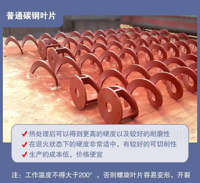 螺旋輸送機應用廣泛,常用于物料的輸送,塊狀、顆粒狀、粉狀等物料,或者一些高溫、腐蝕物料,代替了人工的搬運,效率更高。常見的螺旋葉片有普通碳鋼葉片,高錳鋼葉片以及不銹鋼葉片。