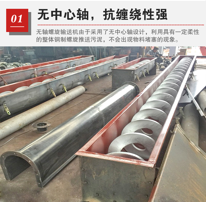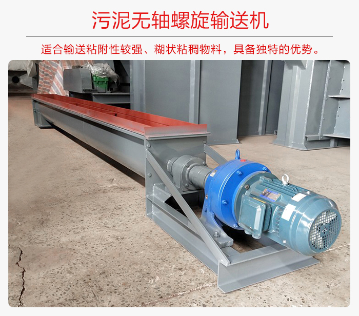 污泥中含有大量的雜質(zhì),使用傳統(tǒng)輸送機對其進行輸送很容易出現(xiàn)堵料現(xiàn)象,嚴重影響輸送效率,無軸螺旋輸送機由于采用了無中心軸設計,利用具有一定柔性的整體鋼制螺旋推送污泥,其抗纏繞性強,不會出現(xiàn)物料堵塞的現(xiàn)象。
