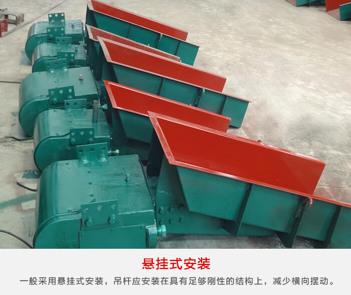 電磁振動給料機一般采用懸掛式安裝,吊桿應安裝在具有足夠剛性的結(jié)構(gòu)上, 為了減少電磁振動給料機的橫向擺動, 懸掛吊桿應向外張開 10°左右布置。對于大型給料機, 為了維修和更換料槽方便,還應設(shè)置移動滑架。