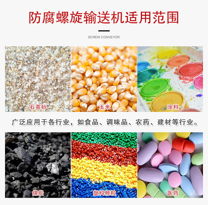 防腐螺旋輸送機廣泛應用于各行業(yè),如食品、調(diào)味品、農(nóng)藥、獸藥、建材、化工、電力、冶金、煤礦炭、糧食等行業(yè),適用于水平或傾斜輸送粉狀、粒狀和小塊狀物料,尤其適合食品、醫(yī)藥行業(yè),滿足行業(yè)衛(wèi)生標準,可輸送諸如面粉、飼料、花椒粉、藥粉等物料。