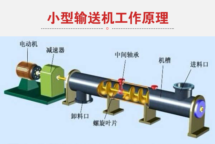 小型旋輸送機(jī)主要有傳動(dòng)裝置、進(jìn)料口、螺旋軸、輸送管、出料口等部件組成。水平螺旋輸送機(jī)是利用旋轉(zhuǎn)的螺旋將被輸送的物料沿固定的機(jī)殼內(nèi)推移而進(jìn)行輸送工作,頭部及尾部軸承移至殼體外,吊軸承采用滑動(dòng)軸承設(shè)有防塵密封裝置,軸瓦一般采用粉末冶金,輸送水泥采用毛氈軸瓦,吊軸和螺旋軸采用滑塊連接。